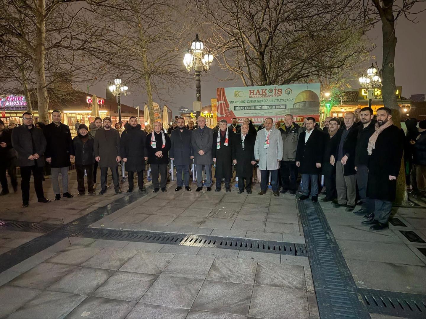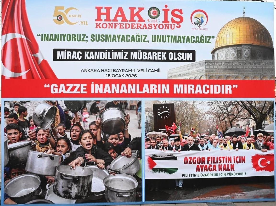 Konfederasyonumuz HAK-İŞ tarafından “İnanıyoruz; Susmayacağız, Unutmayacağız – Gazze İnananların Miraçıdır” temasıyla, 15 Ocak 2026 tarihinde Miraç Kandili vesilesiyle Ankara Hacı Bayram-ı Veli Camii’nde bir program düzenlendi. Programda, Gazze’de hayatını kaybedenler ile tüm şehitlerimiz için Mevlid-i Şerif okutuldu, dualar edildi. Programın ardından binlerce vatandaşa süt ve lokma ikramında bulunuldu. Programa sendikamızı temsilen Genel Sekreterimiz Turgay Ulutürk ile genel merkez personelimiz Yasin Karadeniz katıldı.