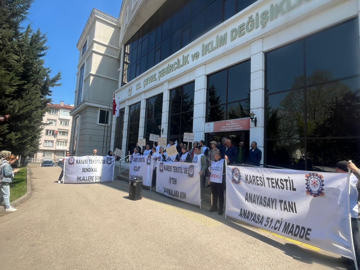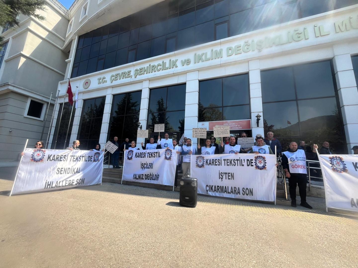 Bursa ve Balıkesir’de faaliyet gösteren R.B.Karesi İthalat İhracat Tekstil Sanayi ve Tic. A.Ş.’de yaşanan sendikal ihlallere ve çevreye zarar verme yönündeki ciddi konulara dikkat çekmek amacıyla Bursa Çevre ve Şehircilik İl Müdürlüğü önünde basın açıklaması gerçekleştirdik.