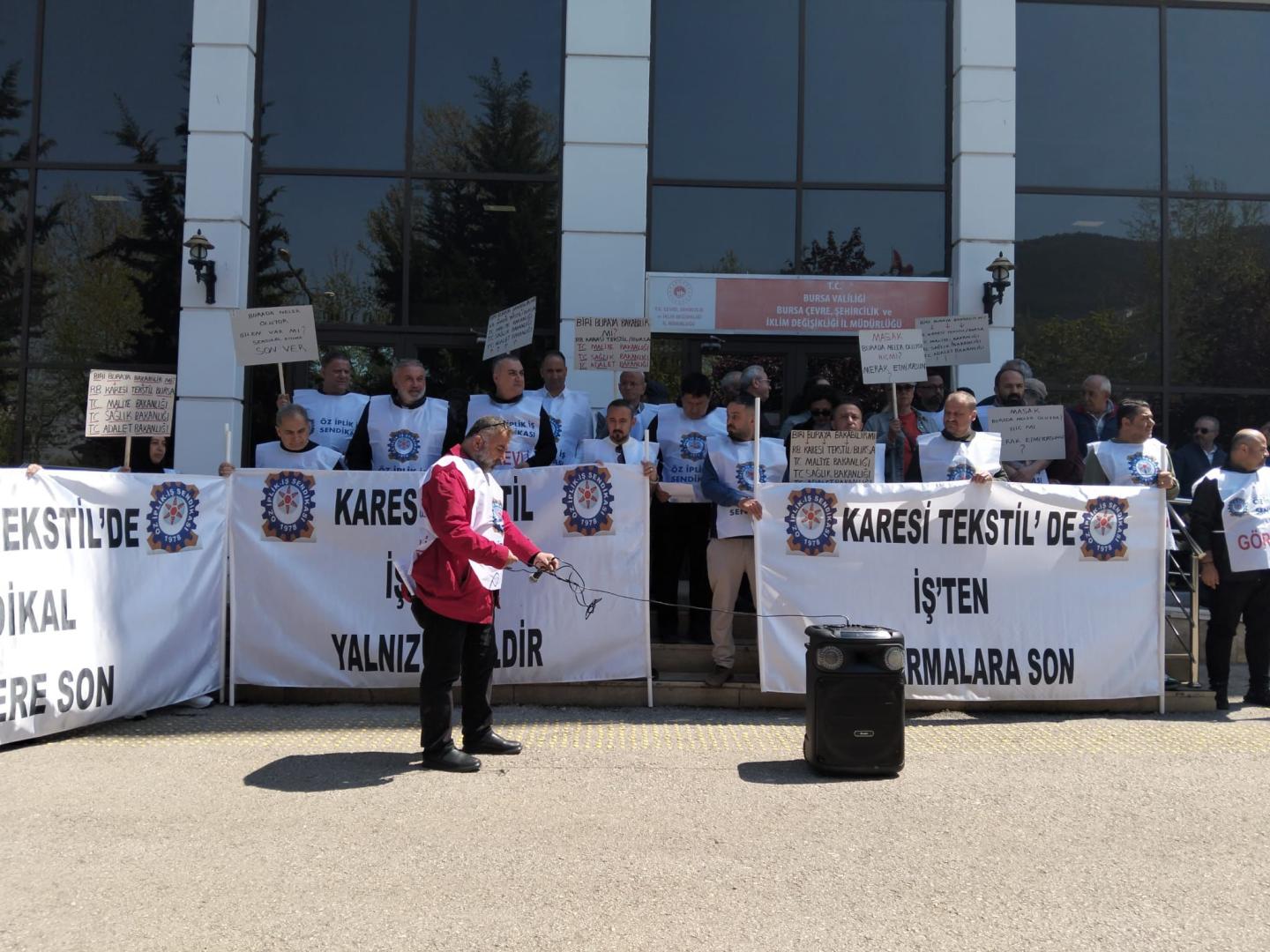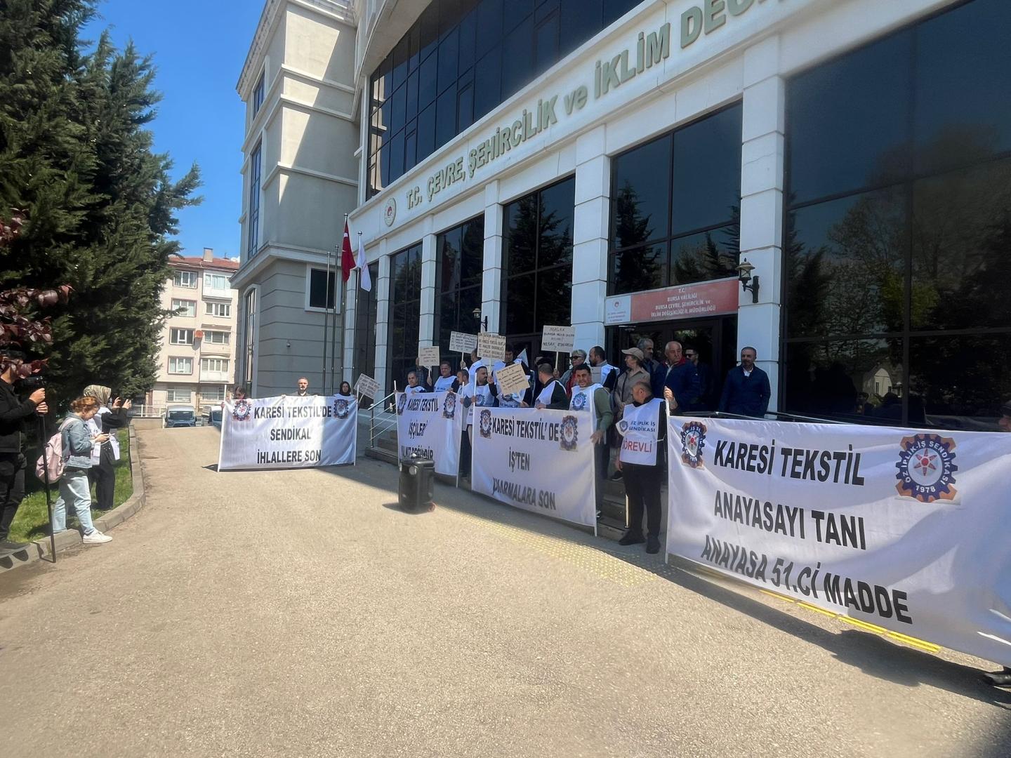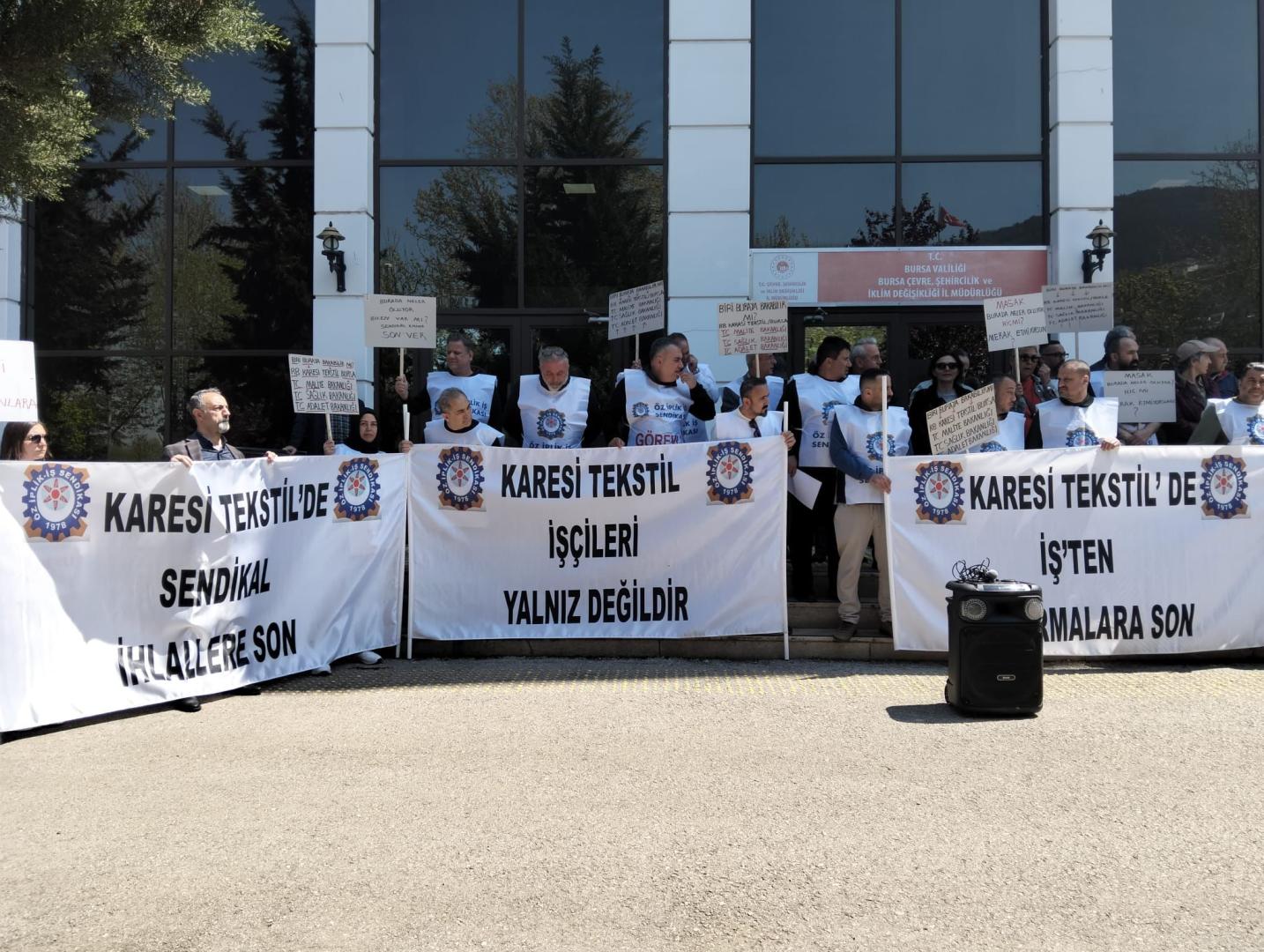 Bursa ve Balıkesir’de faaliyet gösteren R.B.Karesi İthalat İhracat Tekstil Sanayi ve Tic. A.Ş.’de yaşanan sendikal ihlallere ve çevreye zarar verme yönündeki ciddi konulara dikkat çekmek amacıyla Bursa Çevre ve Şehircilik İl Müdürlüğü önünde basın açıklaması gerçekleştirdik.