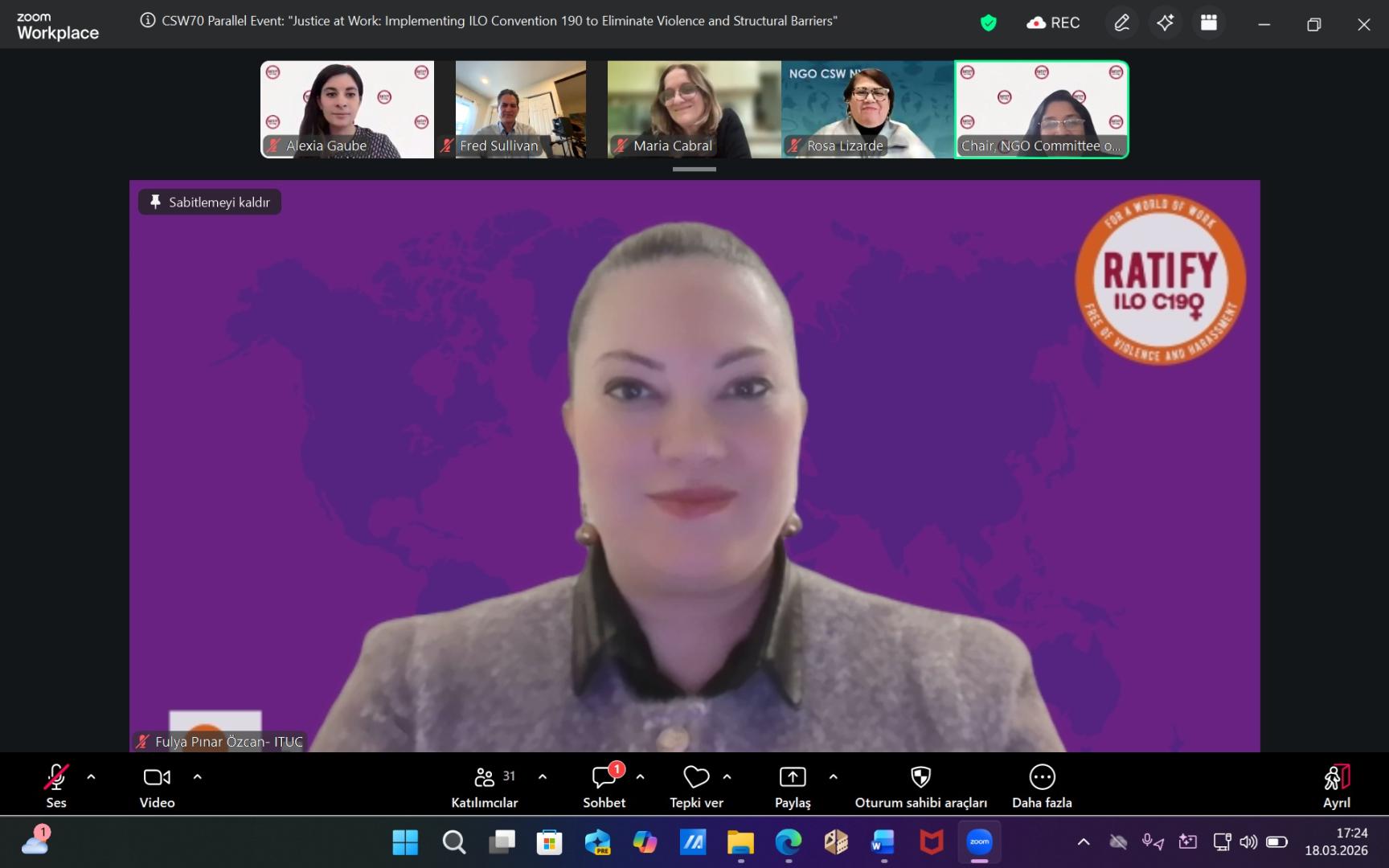 “Çalışma Yaşamında Adalet: Şiddet ve Yapısal Engellerle Mücadelede ILO 190’ın Uygulanması” başlığı altında Özcan, Uluslararası Sendikalar Konfederasyonu (ITUC) adına konuşmacı olarak yer aldı.